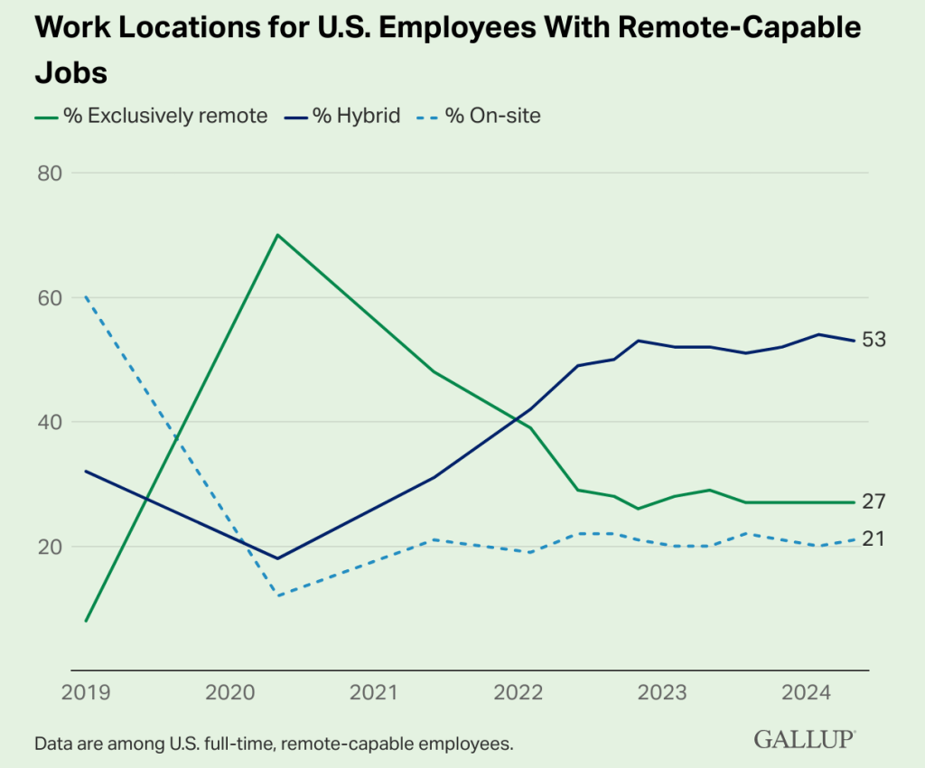 North Carolina is among the top regions in the U.S. for telework. According to data from the 2023 U.S. Census Bureau, Raleigh stood out as the No. 2 city nationwide for remote work, with 24.5% of employees working remotely. Charlotte ranked No. 5 at 21.5%, while Durham secured the No. 9 spot with 19.5%. These statistics highlight the growing trend of remote work in North Carolina, reflecting that the region’s increasing embrace of flexible work arrangements is here to stay long after the pandemic. In 2024, hybrid work has emerged as the most popular form of telework among remote-capable employees, with 53% a mix of on-site and remote work. Hybrid work schedules have eclipsed full-time remote work, which now accounts for 27% of employees. Meanwhile, 21% of employees remain in exclusively on-site roles.